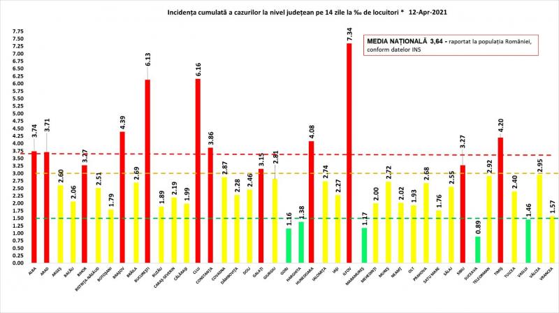 Incidenţa cazurilor de Covid-19 în România - 12 aprilie 2021