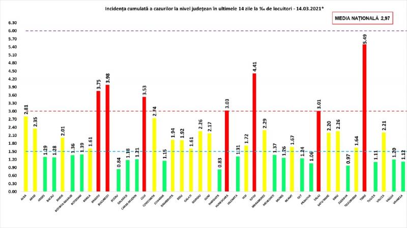 Până astăzi, 21.483 de persoane diagnosticate cu infecție cu SARS – CoV – 2 au decedat. În intervalul 13.03.2021 (10:00) – 14.03.2021 (10:00) au fost raportate 44 de decese (28 bărbați și 16 femei), ale unor pacienți infectați cu noul coronavirus, internați în spitalele din Alba, Argeș, Bacău, Bistrița-Năsăud, Bihor, Brașov, Caraș-Severin, Cluj, Constanța, Dolj, Harghita, Hunedoara, Ialomița, Maramureș, Mehedinți, Satu Mare, Sibiu, Suceava, Timiș, Vaslui, Ilfov și București. Dintre acestea, 3 decese au fost înregistrate la categoria de vârstă 50-59 ani, 15 decese la categoria de vârstă 60-69 ani, 20 decese la categoria de vârstă 70-79 ani și 6 decese la categoria de peste 80 de ani.