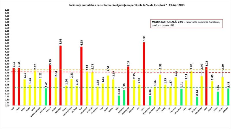 Grupul de Comunicare Strategică a anunțat pentru luni, 19 aprilie 2021, că au fost înregistrate 1.768 cazuri noi cu coronavirus, din 6.484 de teste RT-PCR și 5.431 de teste rapide antigenice. Situaţia detaliată, mai jos.