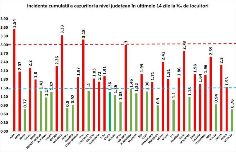 Coeficientul infectărilor cumulate la 14 zile, raportate la 1.000 de locuitori, calculat de către Direcțiile de Sănătate Publică, la nivelul Municipiului București și al județelor este următorul: