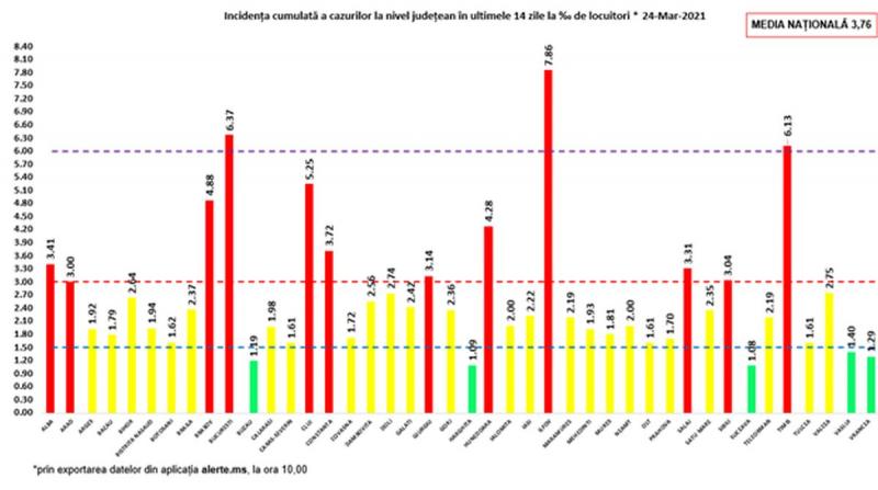 Incidenţa cazurilor de Covid-19 în România - 24 martie 2021