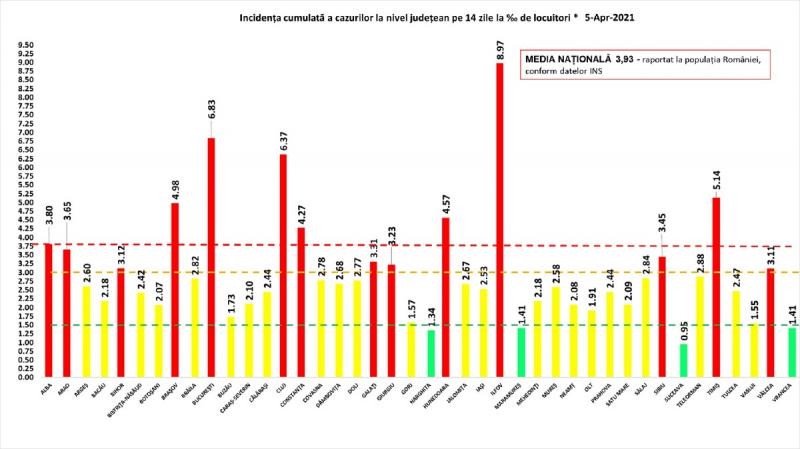 Până astăzi, 5 aprilie, pe teritoriul României, au fost confirmate 977.986 de cazuri de persoane infectate cu noul coronavirus (COVID – 19). 875.487 de pacienți au fost declarați vindecați. În urma testelor efectuate la nivel național, față de ultima raportare, au fost înregistrate 3.611 cazuri noi de persoane infectate cu SARS – CoV – 2 (COVID – 19), acestea fiind cazuri care nu au mai avut anterior un test pozitiv.