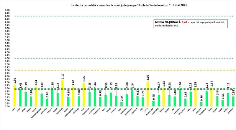 Coeficientul infectărilor cumulate la 14 zile, raportate la 1.000 de locuitori este calculat de către Direcțiile de Sănătate Publică, la nivelul Municipiului București și al județelor. Mai jos aveți graficul realizat în baza raportărilor primite de CNCCI de la Direcțiile de Sănătate Publică: