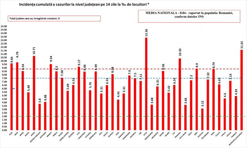 Coeficientul infectărilor cumulate la 14 zile, raportate la 1.000 de locuitori este calculat de către Direcțiile de Sănătate Publică, la nivelul Municipiului București și al județelor.