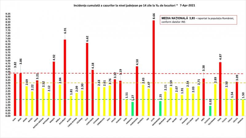 Incidenţa cazurilor de Covid-19 în România - 7 aprilie 2021
