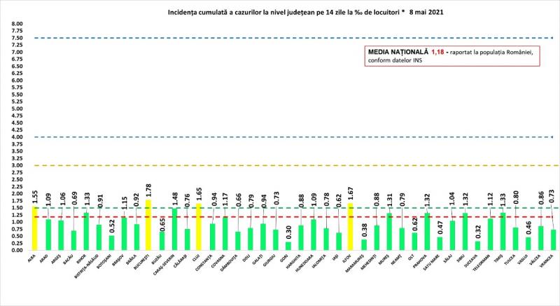 Coeficientul infectărilor cumulate la 14 zile, raportate la 1.000 de locuitori este calculat de către Direcțiile de Sănătate Publică, la nivelul Municipiului București și al județelor. Mai jos aveți graficul realizat în baza raportărilor primite de CNCCI de la Direcțiile de Sănătate Publică: