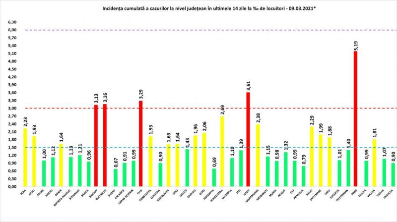Incidenţa cazurilor de Covid-19 în România - 9 martie 2021