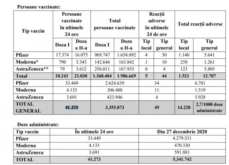1. Numărul de doze administrate împotriva COVID-19 cu vaccinul Pfizer BioNTech (în ultimele 24 de ore): 33.449, din care: 17.374 de persoane vaccinate cu 1 doză; 16.075 de persoane vaccinate cu 2 doze.