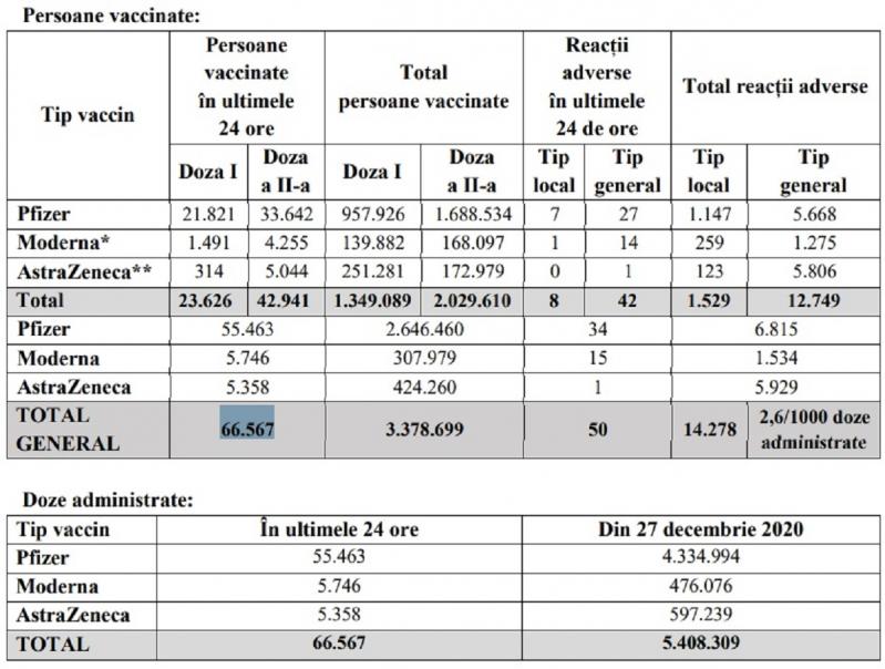 1. Numărul de doze administrate împotriva COVID-19 cu vaccinul Pfizer BioNTech (în ultimele 24 de ore): 55.463, din care: 21.821 de persoane vaccinate cu 1 doză; 33.642 de persoane vaccinate cu 2 doze.