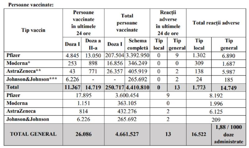 Potrivit datelor puse la dispoziția Comitetului Național de Coordonare a Activităților privind Vaccinarea împotriva COVID-19 (CNCAV) de către Institutul Național de Sănătate Publică (INSP-CNSCBT), prin aplicația Registrul Electronic Național al Vaccinărilor (RENV), care ține evidența vaccinărilor, situația din ziua de 23 iunie a.c., ora 17.00, este următoarea: