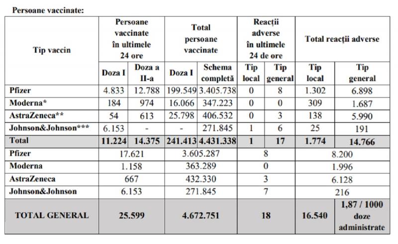 Potrivit datelor puse la dispoziția Comitetului Național de Coordonare a Activităților privind Vaccinarea împotriva COVID-19 (CNCAV) de către Institutul Național de Sănătate Publică (INSP-CNSCBT), prin aplicația Registrul Electronic Național al Vaccinărilor (RENV), care ține evidența vaccinărilor, situația din ziua de 24 iunie a.c., ora 17.00, este următoarea: