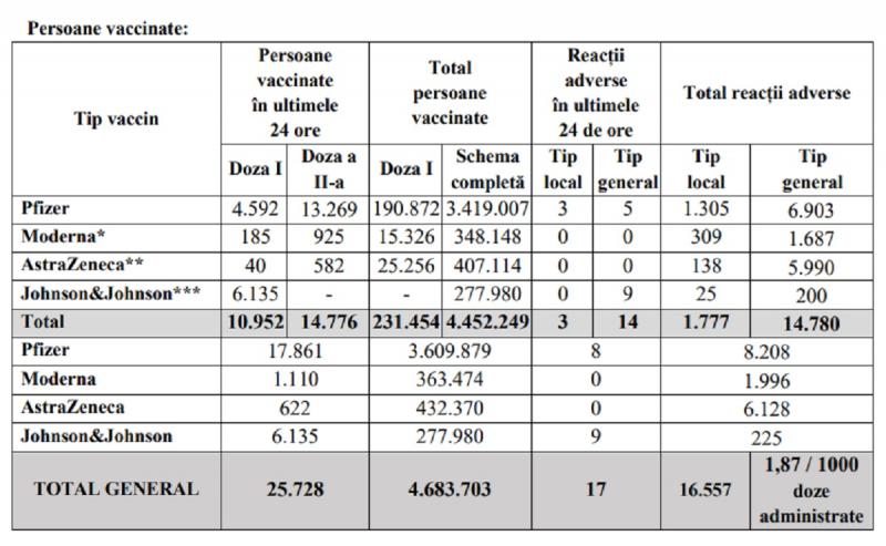 Potrivit datelor puse la dispoziția Comitetului Național de Coordonare a Activităților privind Vaccinarea împotriva COVID-19 (CNCAV) de către Institutul Național de Sănătate Publică (INSP-CNSCBT), prin aplicația Registrul Electronic Național al Vaccinărilor (RENV), care ține evidența vaccinărilor, situația din ziua de 25 iunie a.c., ora 17.00, este următoarea: