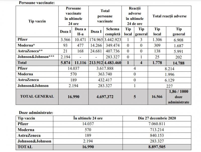 Potrivit datelor puse la dispoziția Comitetului Național de Coordonare a Activităților privind Vaccinarea împotriva COVID-19 (CNCAV) de către Institutul Național de Sănătate Publică (INSPCNSCBT), prin aplicația Registrul Electronic Național al Vaccinărilor (RENV), care ține evidența vaccinărilor, situația din ziua de 27 iunie a.c., ora 17.00, este următoarea: