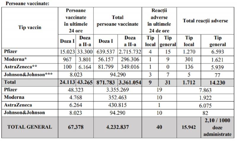 Potrivit datelor puse la dispoziția Comitetului Național de Coordonare a Activităților privind Vaccinarea împotriva COVID-19 (CNCAV) de către Institutul Național de Sănătate Publică (INSP-CNSCBT), prin aplicația Registrul Electronic Național al Vaccinărilor (RENV), care ține evidența vaccinărilor, situația din ziua de 27 mai a.c., ora 17.00, este următoarea: