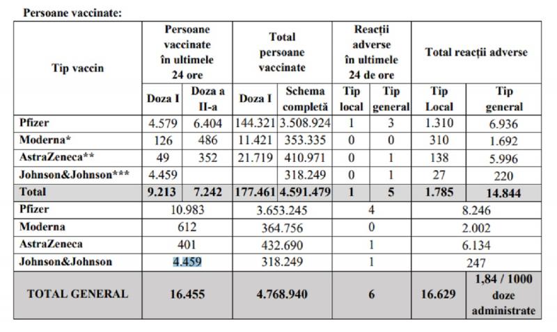 4. Numărul de doze administrate împotriva COVID-19 cu vaccinul Johnson & Johnson (în ultimele 24 de ore): 4.459. Vaccinul nu necesită rapel.