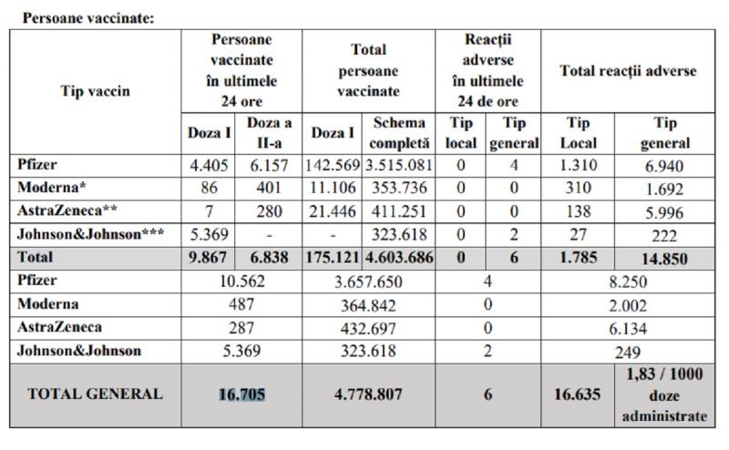 5. Numărul de reacții adverse înregistrate la nivelul centrelor de vaccinare: 6, dintre care 4 reacții la vaccinul Pfizer, 0 reacții adverse la vaccinul Moderna, 0 reacții adverse la vaccinul AstraZeneca și 2 reacţii adverse la vaccinul Johnson & Johnson.