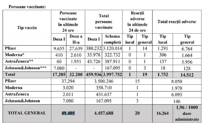 Potrivit datelor puse la dispoziția Comitetului Național de Coordonare a Activităților privind Vaccinarea împotriva COVID-19 (CNCAV) de către Institutul Național de Sănătate Publică (INSP-CNSCBT), prin aplicația Registrul Electronic Național al Vaccinărilor (RENV), care ține evidența vaccinărilor, situația din ziua de 7 iunie a.c., ora 17.00, este următoarea: