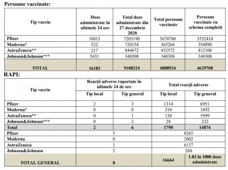 Potrivit datelor puse la dispoziția Comitetului Național de Coordonare a Activităților privind Vaccinarea împotriva COVID-19 (CNCAV) de către Institutul Național de Sănătate Publică (INSP-CNSCBT), prin aplicația Registrul Electronic Național al Vaccinărilor (RENV), care ține evidența vaccinărilor, situația din ziua de 9 iulie a.c., ora 17.00, este următoarea: