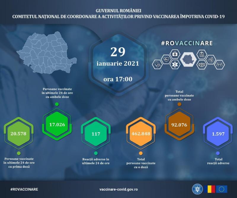 Potrivit datelor puse la dispoziția CNCAV de către Institutul Național de Sănătate Publică, prin aplicația Registrul Electronic Național al Vaccinărilor (RENV), care ține evidența vaccinărilor, situația din ziua de 29 ianuarie a.c., ora 17.00, este următoarea: