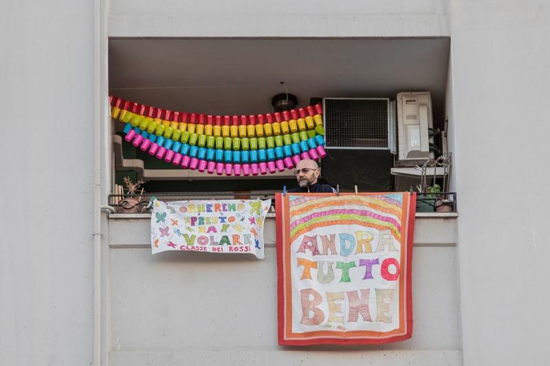 Ora 12.40- Bărbat urmărind de la balconul său spectacolul "Sotto lo Stesso Cielor" (Sub acelaşi cer) din faţa unei clădiri, în timpul pandemiei, în Roma, Italia.