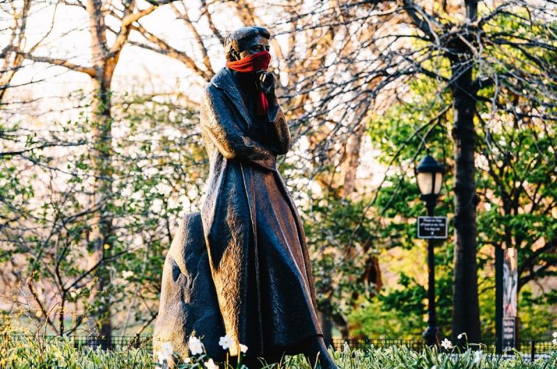 Ora 13.40- Statuie acoperită cu o eşarfă în jurul gurii ca atenţionare asupra răspândirii virusului, la Spitalul Lenox Hill din Upper East Side, New York.