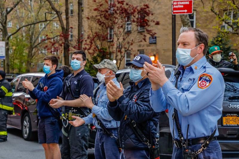 Ora 14.15- Cadre medicale aplaudate de localnici, poliţişti şi pompieri, în faţa unui spital din Manhattan, New York, în timpul pandemiei COVID-19 din Statele Unite.
