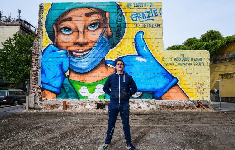 Ora 17.30- Artistul stradal Lapo Fatai pozează în fața unei picturi pe care a realizat-o lângă San Luca din Milano, Italia, în onoarea cadrelor medicale pentru lupta împotriva noului coronavirus.