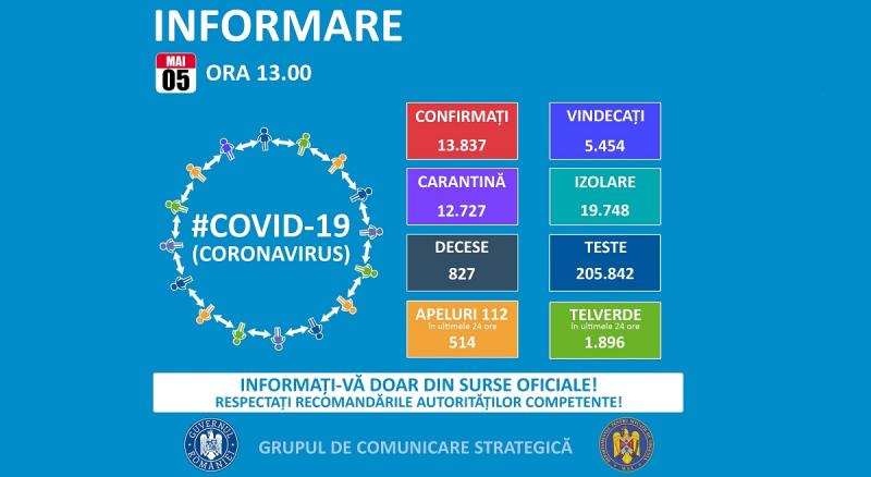 "Până astăzi, 5 mai, pe teritoriul României, au fost confirmate 13.837 de cazuri de persoane infectate cu virusul COVID – 19 (coronavirus). Dintre persoanele confirmate pozitiv, 5.454 au fost declarate vindecate și externate." potrivit Grupului de Comunicare Strategică.