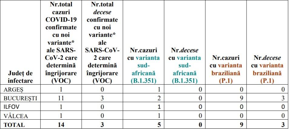 ”Au fost confirmate 1.128 cazuri cu variante ale SARS-CoV-2 care determină îngrijorare (VOC), respectv 1.114 varianta braziliană, 5 varianta sud-africană şi 9 varianta braziliană. La unul din cazurile confirmate cu linia genetică B.1.1.7, având judeţ de infectare Suceava, a fost depistată mutaţia E484K. La unul din cazurile confirmate cu linia genetică B.1.351, având judeţ de infectare Ilfov, a fost depistată mutaţia E484K. La unul din cazurile confirmate cu linia genetică P.1, infectat în mun.Bucureşti, a fost depistată mutaţia E484K. Mutaţia E484K nu reprezintă ea însăşi o nouă variantă, ci este o mutaţie care a fost identificată iniţial la varianta sud-africană (B.1.351), apoi braziliană B.1.1.28 (diferită de VOC B.1.351) şi, mai recent, la cea britanică (B.1.1.7). Mutaţia se află în proteina spike şi pare să aibă un impact asupra răspunsului imun al organismului şi, posibil, asupra eficacităţii vaccinale, în sensul scăderii acesteia”, a transmis INSP.