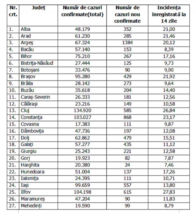 Lista pe judeţe a cazurilor Covid în România, 13 februarie 2022