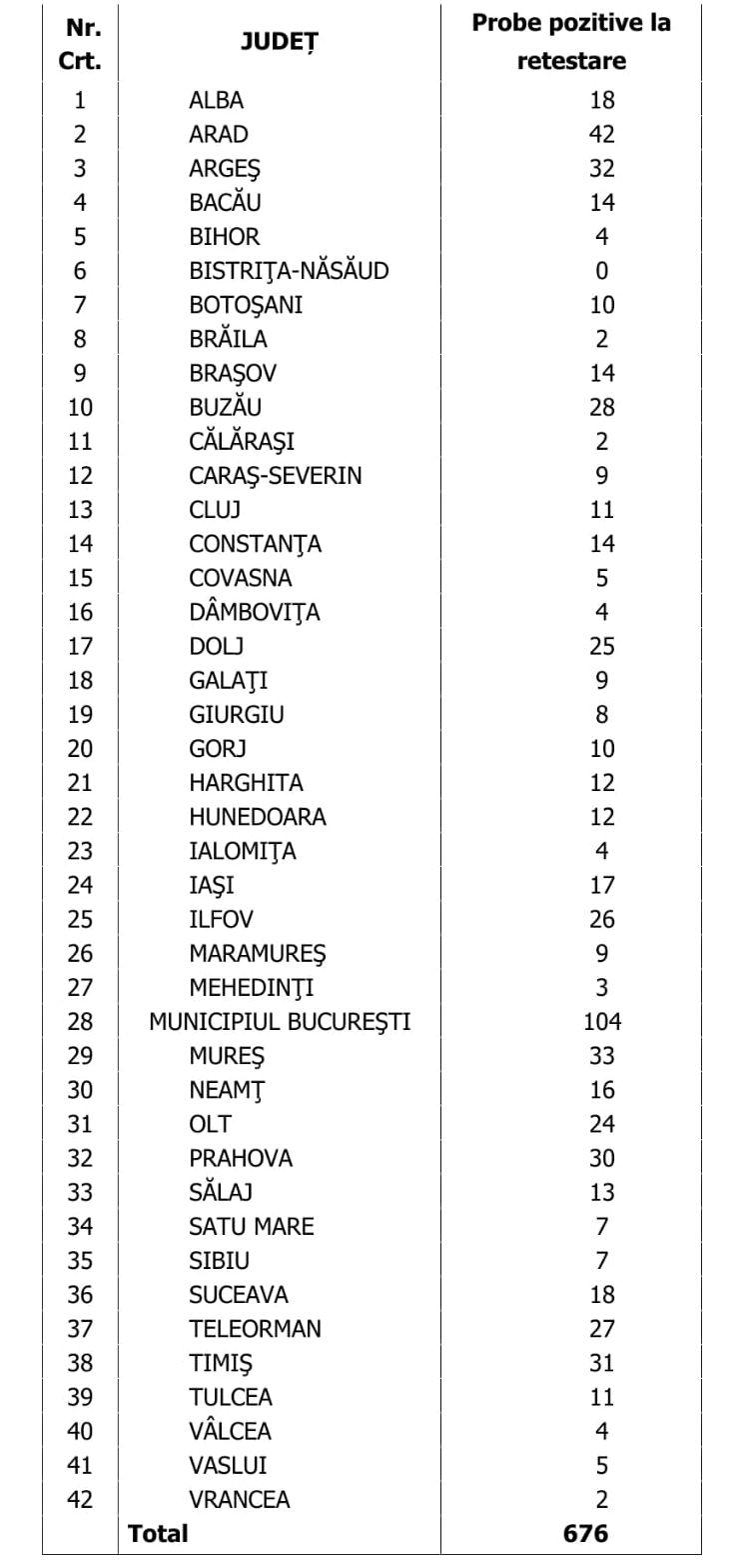 În ultimele 24 de ore au fost înregistrate 3.076 de cazuri noi de persoane infectate cu SARS – CoV – 2 (COVID – 19), dintre care 50 sunt ale unor pacienți reinfectați, testați pozitiv la o perioadă mai mare de 180 de zile după prima infectare. Distinct de cazurile nou confirmate, în urma retestării pacienților care erau deja pozitivi, 676 de persoane au fost reconfirmate pozitiv.