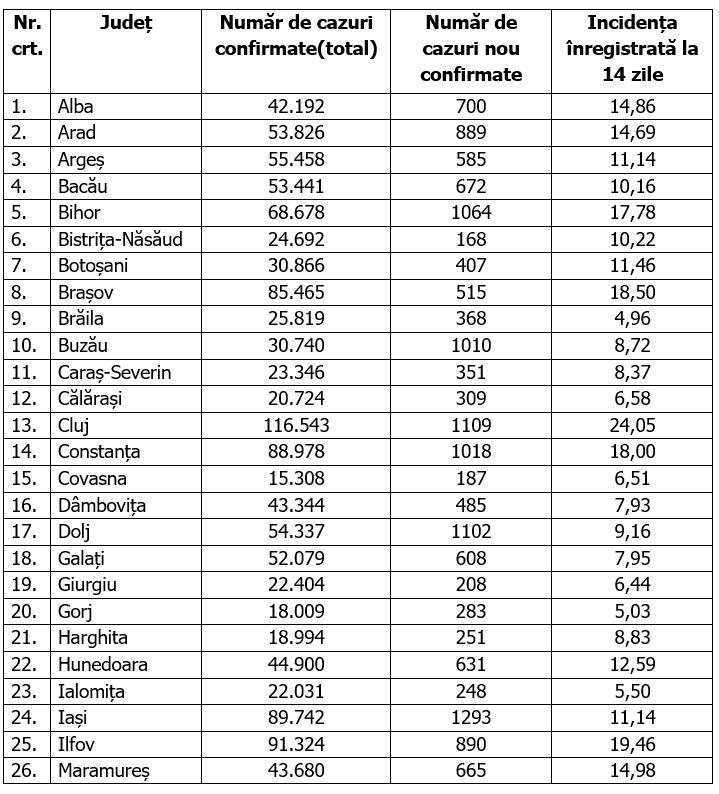 Lista pe judeţe a cazurilor Covid în România, 2 februarie 2022