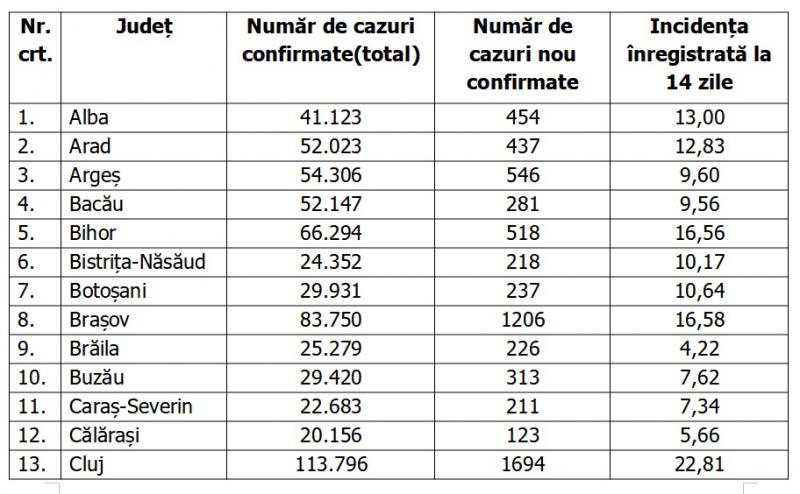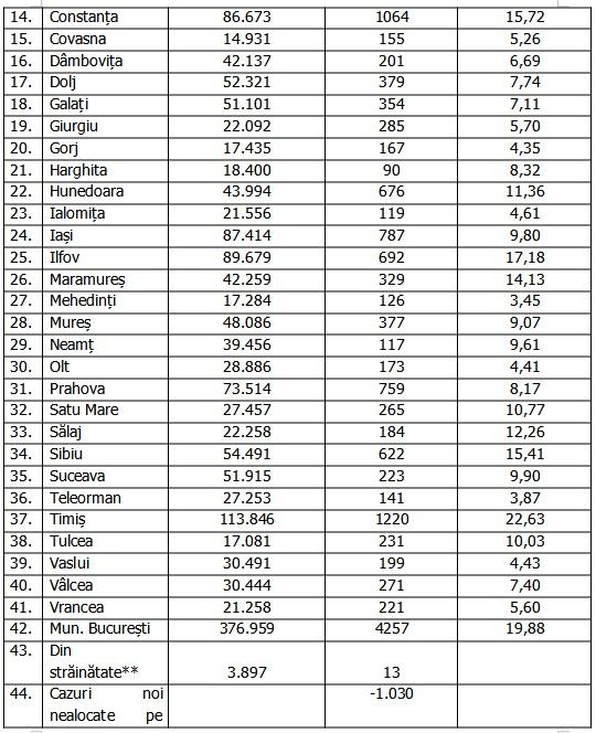 Lista pe judeţe a cazurilor Covid în România, 31 ianuarie 2022