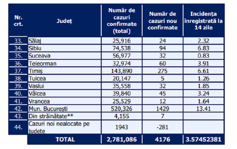 În ultimele 24 de ore au fost înregistrate 4.176 de cazuri noi de persoane infectate cu SARS – CoV – 2 (COVID – 19), cu 1.285 mai putin decât în ziua anterioară. 533 dintre cazurile noi din 24 de ore sunt ale unor pacienți reinfectați, testați pozitiv la o perioadă mai mare de 90 de zile după prima infectare.