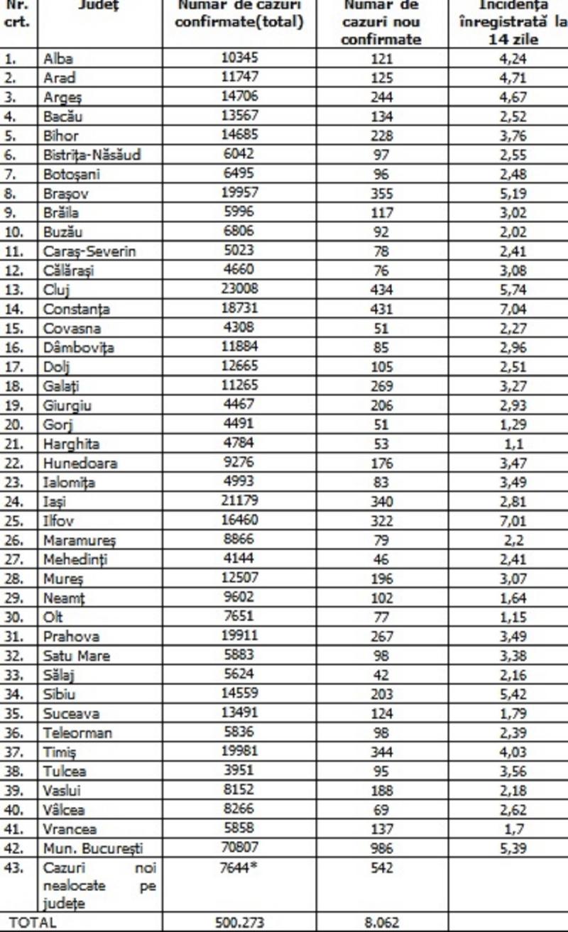 Până astăzi, 4 decembrie, pe teritoriul României, au fost confirmate 500.273 de cazuri de persoane infectate cu noul coronavirus (COVID – 19).