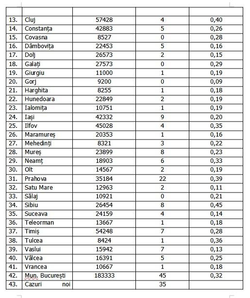 Cele mai mmulte cazuri noi au fost raportate în municipiul București (45).
