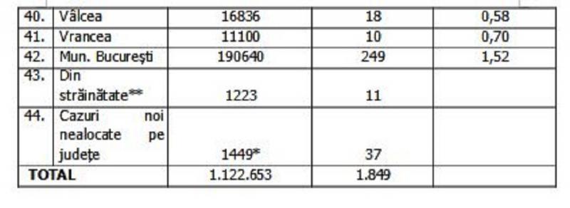În urma testelor efectuate la nivel național, față de ultima raportare, au fost înregistrate 1.849 cazuri noi de persoane infectate cu SARS – CoV – 2 (COVID – 19), acestea fiind cazuri care nu au mai avut anterior un test pozitiv. Distinct de cazurile nou confirmate, în urma retestării pacienților care erau deja pozitivi, 142 persoane au fost reconfirmate pozitiv.