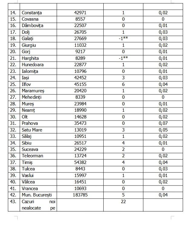 6 dintre aceste decese sunt anterioare intervalului mai sus menționat și au fost introduse în baza de date, la solicitarea Ministerului Sănătății, de către Direcțiile de Sănătate Publică din țară, în urma verificărilor efectuate.