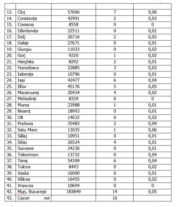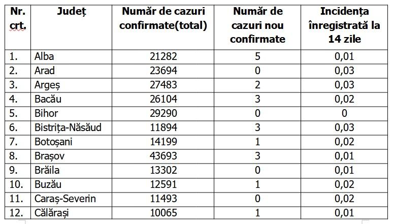 Lista pe judeţe a cazurilor de COVID în România, 20 iulie 2021