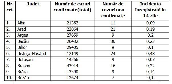 Lista pe judeţe a cazurilor de coronavirus în România, 25 august 2021