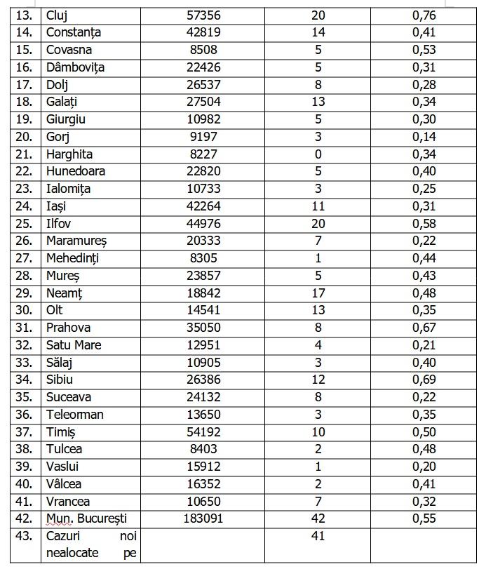 La nivel județean, Cluj şi Ilfov au cele mai multe îmbolnăviri nou confirmate, câte 20. Urmează județul Bihor și Neamț - 17, județul Brașov - 16, judeţul Constanța – 14.
