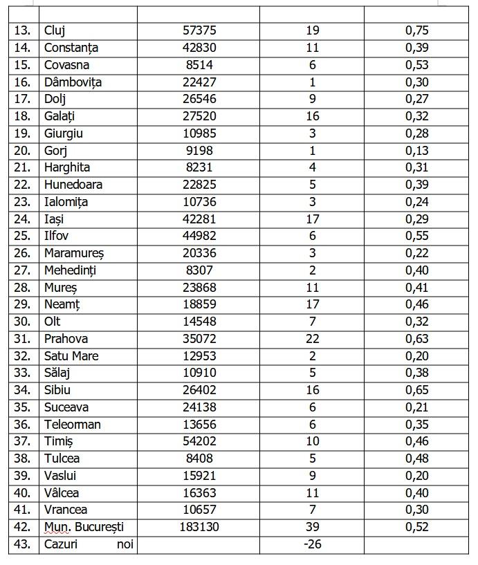 Lista pe judeţe a cazurilor de coronavirus în România, 26 mai 2021