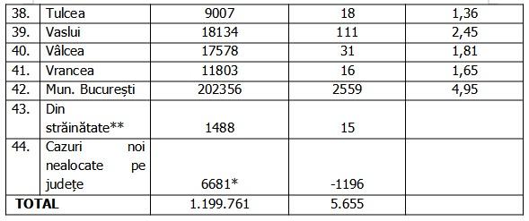 În urma testelor efectuate la nivel național, față de ultima raportare, au fost înregistrate 5.655 cazuri noi de persoane infectate cu SARS – CoV – 2 (COVID – 19), dintre care 126 sunt ale unor pacienți reinfectați, testați pozitiv la o perioadă mai mare de 180 de zile după prima infectare.