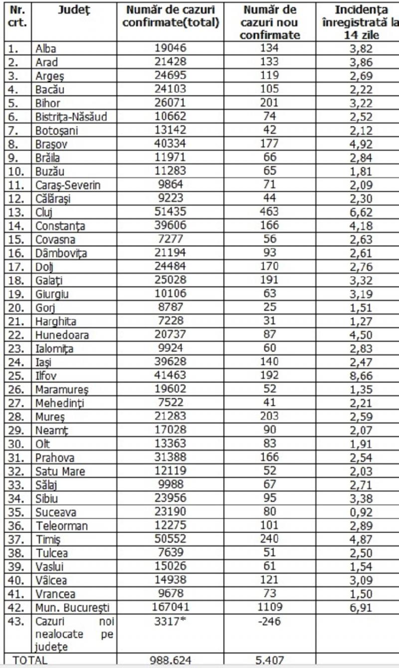 Lista pe judeţe a cazurilor de coronavirus în România, 7 aprilie 2021