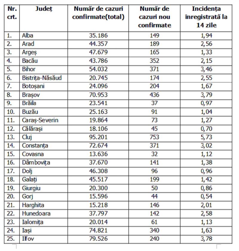 Lista pe judeţe a cazurilor de Covid în România, 14 ianuarie 2022