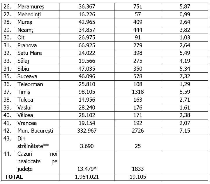 Lista pe judeţe a cazurilor de Covid în România, 20 ianuarie 2022