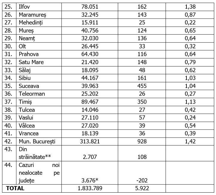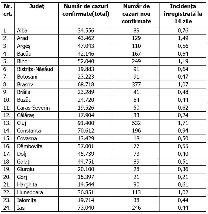 Lista cazurilor COVID pe judeţe, 7 ianuarie 2022