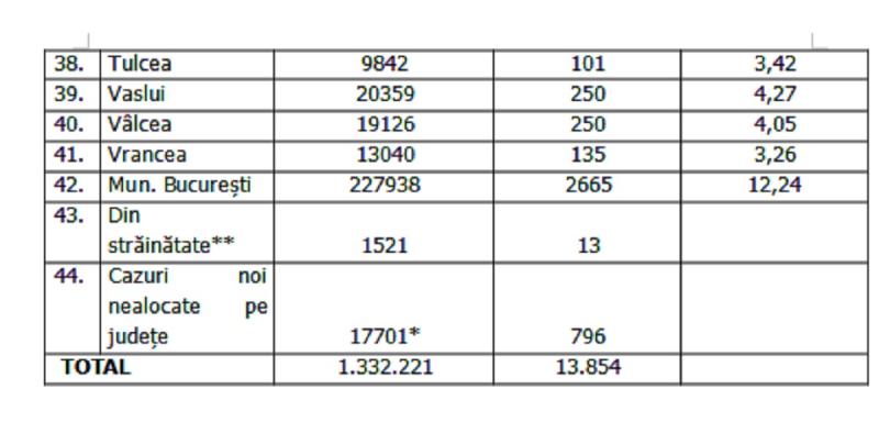 În urma testelor efectuate la nivel național, față de ultima raportare, au fost înregistrate 13.854 cazuri noi de persoane infectate cu SARS – CoV – 2 (COVID – 19), acestea fiind cazuri care nu au mai avut anterior un test pozitiv. Distinct de cazurile nou confirmate, în urma retestării pacienților care erau deja pozitivi, 1.198 persoane au fost reconfirmate pozitiv.