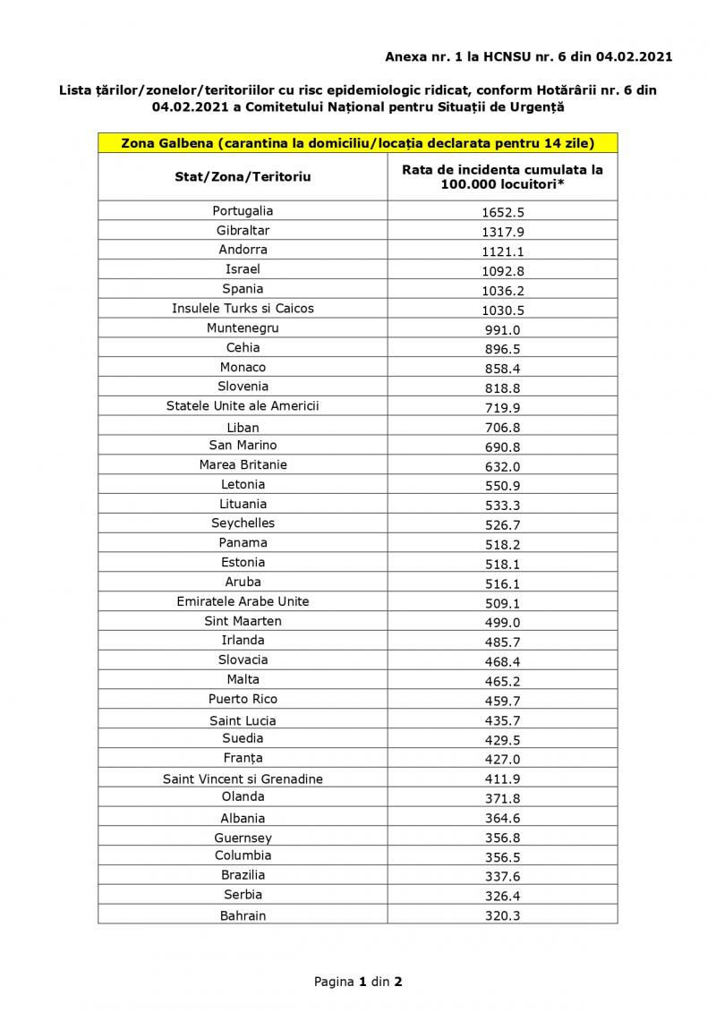 „Art.1 - Se aprobă lista țărilor/zonelor/teritoriilor cu risc epidemiologic ridicat pentru care se instituie măsura carantinei asupra persoanelor care sosesc în România din acestea, prevăzută în anexa nr. 1.