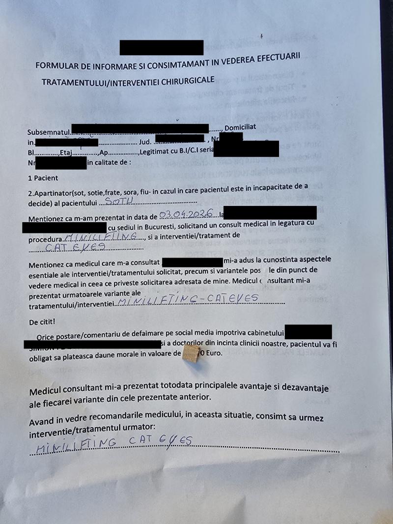 În același contract apare și o clauză controversată: orice postare sau comentariu considerat defăimător la adresa clinicii sau a medicilor ar putea atrage obligația de a plăti daune morale.